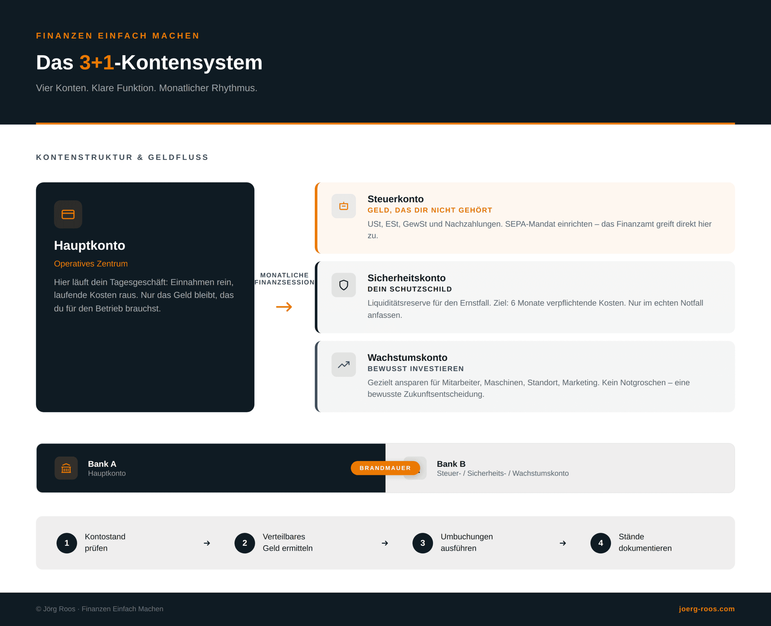 Das 3+1-Kontensystem ist kein Zauberwerk. Es ist ein Werkzeug. Aber wie jedes gute Werkzeug entfaltet es seine Wirkung erst, wenn du es regelmäßig nutzt. Die monatliche Finanzsession, die bewusste Verteilung, die Disziplin bei Entnahmen und Ausgaben – das ist der Unterschied zwischen einem Betrieb, der von der Hand in den Mund lebt, und einem Unternehmen, das auf solidem Fundament steht.