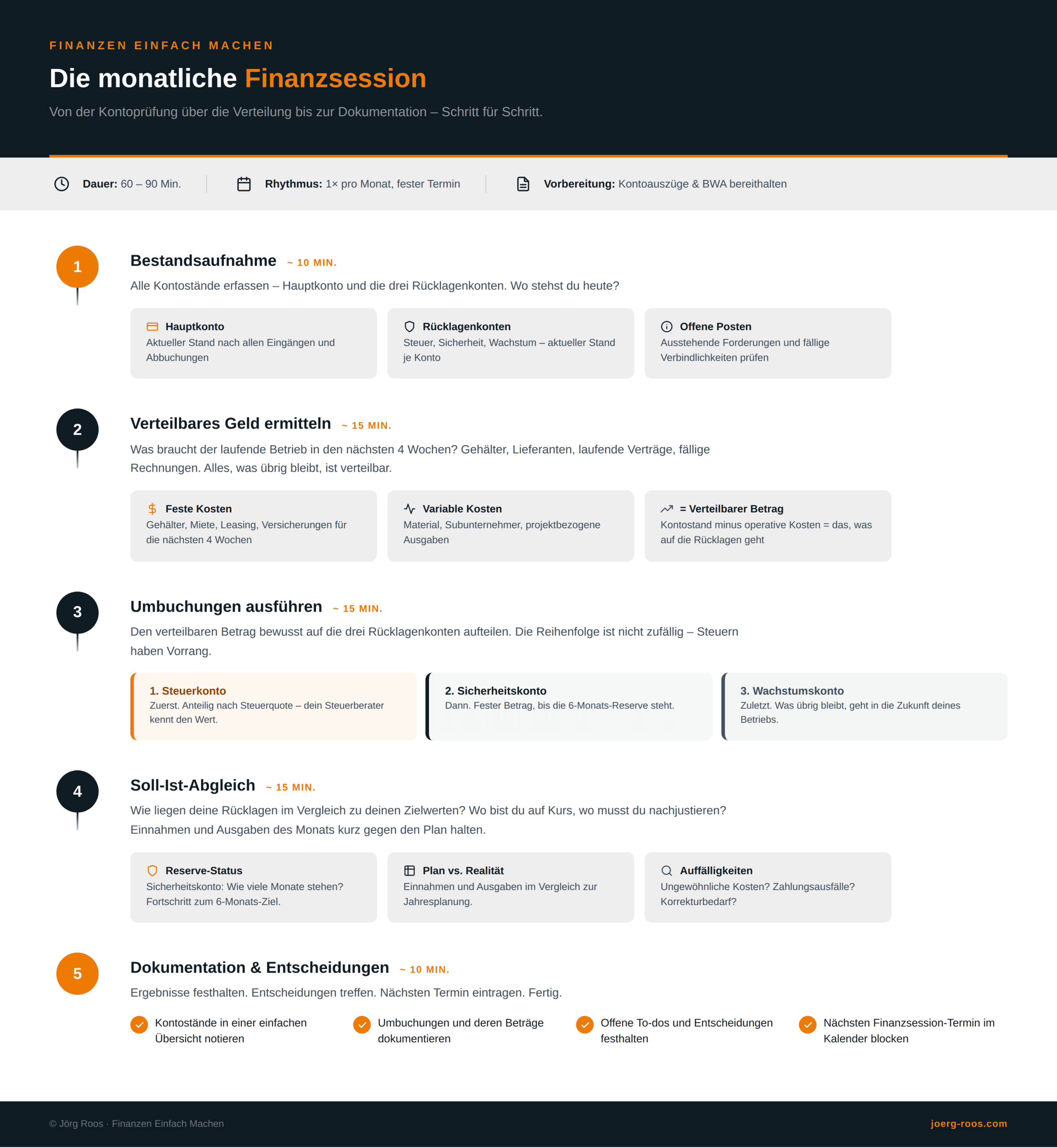 Das beste Kontensystem bringt nichts, wenn du es nicht aktiv nutzt. Deshalb ist ein fester Termin im Monat unverzichtbar: die Finanzsession. Ein Termin, an dem du dir 60 bis 90 Minuten Zeit nimmst, um deine Zahlen zu prüfen und die Umbuchungen von deinem Hauptkonto auf die Rücklagenkonten vorzunehmen.